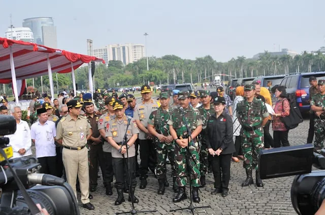 Apel Konsolidasi Operasi Ketupat Jaya 2019 dan Kesiapan Pengamanan Sidang PHPU di Mahkamah Konstitusi diikuti oleh ribuan personel TNI, Polri, Satpol PP DKI, Dinas Perhubungan DKI dan petugas Pemadam Kebakaran DKI.